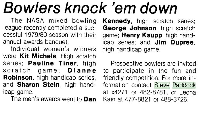 As for the "Bowlers knock 'em down" newpaper in particular, we can again trace this back to Gorham via the phone number listed. Looking at the newspaper, it says, "For more information contact Steve Paddock at x4271 or 482-8781..." Looking at an archived February, 1980 NASA Lyndon B. Johnson Space Center Telephone Directory [5], on page sixty, under extension 4271, we see "PADDOCK S. G., McDonnell Douglas", the same extension listed on the "Bowlers knock em' down" advertisement.